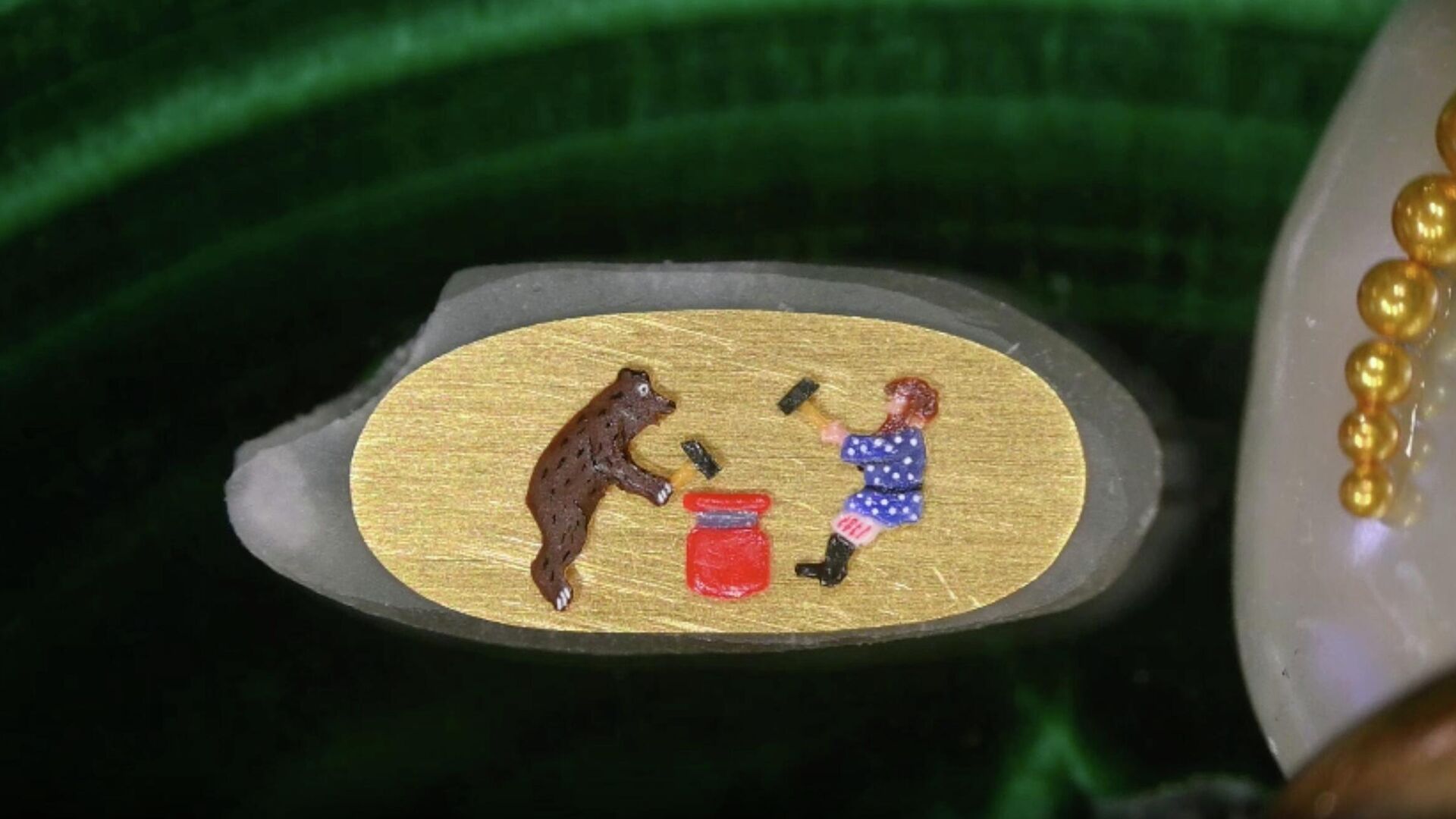 Известный мастер микроминиатюры из Новосибирска Владимир Анискин впервые создал движущуюся миниатюру "Мужик и медведь" на рисовом зернышке.
